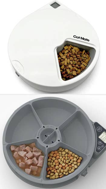 We hope you love our recommendations! While every product is independently chosen by our editors, BuzzFeed and our publishing partners may collect a share of sales or other compensation from the links on this page. You can read more about how our affiliate partnerships work in our Editorial Standards & Ethics Guide. Picture this: Your kitty will no longer wake you up before dawn screaming for food *and* they'll be fed when you leave home for more than a few hours. Shopping for the light of your life (aka your cat) can be challenging, especially when you want a product you can trust to function properly and feed them on time. Cats have vastly different needs, so automatic cat feeders are not a one-size-fits-all item. There are Wi-Fi devices that work with a smartphone app, feeders with built-in cameras, ones that are specifically designed for wet food, and more. Rest assured, you'll get your money's worth with an automatic cat feeder that takes care of meal time for you. What's better than an investment both you *and* your kitto will benefit from? The 5-liter model can store up to a whopping 5 pounds of food, which means you won't have to refill it as often. You can even program their mealtimes directly from the smartphone app. Dispensing manual feedings is also an option. Best of all, you won't be woken up at the crack of dawn with a four-legged tyrant screaming in your ear. Bless! Psst — It also has a built-in desiccant bag and sealing strip to keep food fresh! Promising reviews: "We are vacationing for a month in Arizona and wanted an automatic feeder for our cat in case our cat sitter couldn’t get to our house. We can add an extra feeding remotely. We are very pleased with our purchase. We can easily adjust the amounts and times of feeding, even from a thousand miles away. When the cat hears the voice say 'mealtime,' she comes running. We are able to control her diet because we aren’t arbitrarily feeding her." —Jan D "I was worried this wouldn't work, but it's extremely simple to use. I have cameras that watch my cats when I'm away, so to test it, I fed my cats through the app and went to view the camera. I can see it feeding them live with no delay. I have it set to a schedule, so even when I'm at home, my cats don't wake me up at 5 a.m. demanding to be fed. And I know it's working because I can hear it go off every day at the scheduled time." —s a Get it from Amazon for $89.99 (available in two sizes, in black or white, and in a dual-bowl style). This wallet-friendly option has all the bells and whistles you need to keep your feline happy without spending a fortune. It allows you to program up to six feedings per day and can hold nearly 17 cups of dry food in the airtight storage. It allows you to record a 10-second meal call with your voice that plays when a feeding is dispensed. You can also add three backup D batteries to ensure the feeder keeps functioning during power outages. Bonus: The dishwasher-safe hopper *and* bowl can be easily disassembled and cleaned. Promising review: "This is great for me since I get home at different times and can't always be home at feeding time. It's reliable and easy enough to program if you read the instructions. The portions make it so your cats don't overeat — just do some basic measuring and testing with the one-time feed button. If you already feed them from a gravity feeder, then just experiment over a week or two and look up recommended feed amounts for the weight of your animal. Extremely long battery life — I don't even bother plugging mine in, and I don't need to use the voice feature because the sound of the food hitting the bowl sends them running." —high-o silver Get it from Amazon for $39.99+ (available in white or green and in three styles). Using an automatic cat feeder may require more diligence in multi-pet households, especially if any of 'em are on a prescription diet. This is also helpful when you have a food thief on your hands who will try to steal their sibling's leftovers! This feeder pairs with your cat's microchip, so only they can access it. When they walk away, it closes to protect any food they may have left in the dish. Each dish can hold 13.5 ounces of wet or dry food. The lid closes and forms a tight seal, helping retain moisture and keeping food fresher longer. Note: This feeder is compatible with 9-digit (Avid Secure), 10-digit (FDXA), and 15-digit (FDXB) microchip numbers. Check with your vet if you're unsure about your pet's microchip number! BuzzFeed editor Jenae Sitzes says: "I've had my microchip pet feeders from Sure Petcare for a couple of months now, and while it was a pricey investment, it's been worth every single penny and has alleviated a ton of stress around my cat's meals. One of my cats, Sneaky, always wants to eat his brother's food and has a tendency to be overweight. Separating them for meals just wasn't working — they would whine at the door and simply not eat enough unless they could eat side by side and have free access to food throughout the day — but I also couldn't be sure that my younger (and much smaller) cat, Chicho, was eating enough with Sneaky gobbling up part of his meals, too. When my vet started throwing around the word "diabetes" as a very real concern if Sneaky didn't start sticking to controlled diet every day, I knew I needed to finally cough up the money for microchip feeders — I mean, it'd be a drop in the bucket compared to the long-term cost of cat insulin. The setup was ridiculously fast, the open-close function works beautifully, and my cats learned how to use these almost immediately. Finally, Sneaky can *only* eat what's in his feeder, which allows me to control his calorie intake and see exactly how much food he's eating daily — and I can be sure that Chicho is getting *enough* food, too. This is also a fantastic solution if you have cats on different diets due to health reasons, and if one of them starts eating way less for some reason, you'l