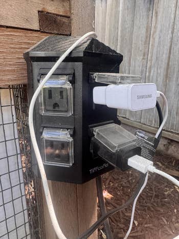 Promising review: "This item was just as described. It has six grounded outlets on a stake (which can also be wall-mounted) with a 50-foot cord that will support power tools. I recently assembled a resin shed behind my house, but couldn't really run power to it (pictured above, right). This was the perfect solution: I stationed it just outside the door, where it is accessible for whatever project or activity requires power. I love that there is a covered on/off switch on the back, so there is no power to the actual outlets until the stake is turned on. Perfect solution to my problem!" —Sara Weamer