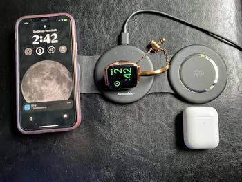 Promising review: "PERFECTION. I wanted a charger that would fit on my desk and also be compact for traveling. This charger fits all my needs. I love the triangle layout for my desk because it doesn't take up much room and keeps everything accessible. The raised ring really enables a flush connection with my iPhone 14 Plus, which is so hard because of the enormous camera. So the charging is AMAZING. When I travel, it fits compactly in my back and allows me to charge what I need when I need it. Stop looking! You've found a great charger!" —S. Seiler