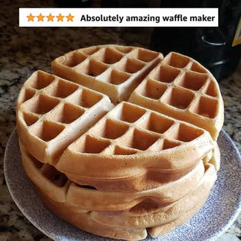 Promising review: "Stop looking and buy this waffle maker. This is THE waffle maker to buy. I love it. The waffles are a perfect thickness and come out crisp and brown every time. Every feature of this waffle maker is intuitive, easy to use, and functions the way it's supposed to. I love that you don't need to spray it with cooking spray; the nonstick coating works like a charm. Nothing has ever stuck to it. The timer is a very convenient feature and easy to use. I've already used it to cook regular waffles, gluten-free waffles, savory waffles (cheddar and bacon), Thanksgiving stuffing waffles, and mashed potato waffles. You name it, this thing can turn it into a waffle. I leave it out on my counter all the time, and its stand-up feature ensures that it doesn't take up a lot of space. It's a bit difficult to clean if the waffle batter gets stuck in the grooves running around the outside or on the black handles, but this is a small issue with a wonderful machine." —Brian M.
