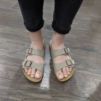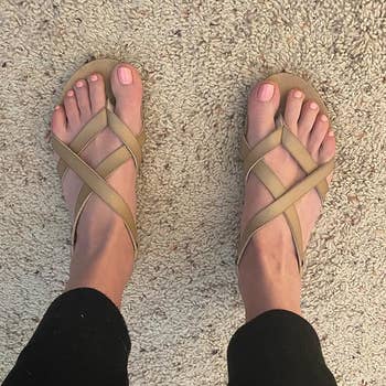 Promising review: "I have short, wide feet and short toes, so sandals can be a challenge for me. For comparison, I also ordered a pair of Vionic sandals in a 5 wide that fit me perfectly and felt great, but looked more 'orthopedic' than I liked. These sandals support my feet better than I expected. There’s not much arch support, but there’s support in the heel area, and I’ve walked in them for several hours with no blisters or sore feet, so I plan to take them with me on a trip to Greece, where I expect to do a lot of walking. They’re really cute with shorts, palazzo pants, and summer skirts, and the price is very reasonable." —LH