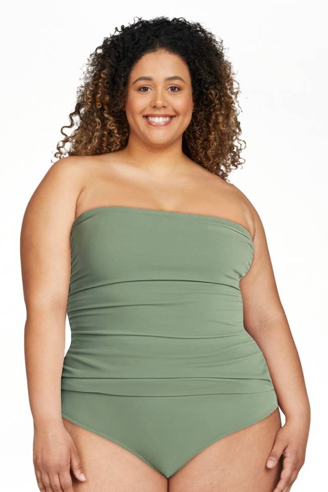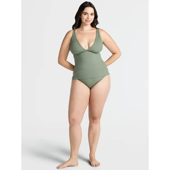 Promising review: "The bottoms are actually full coverage and feel very secure! The top is modest with adjustable straps. The color was a little less 'sage' and a little more true 'green' than I expected, but still beautiful. This will be great for play and walks with my family! I am currently using this as a maternity swimsuit, so I cannot attest to any tummy control, but it is comfortable on my small bump." —Rebecca