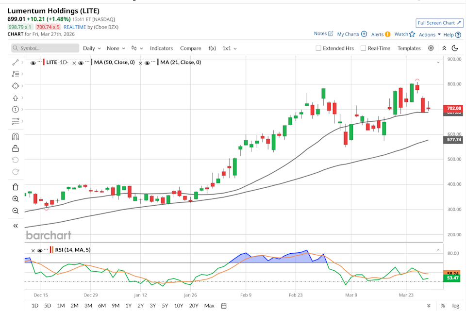 Shares of Lumentum Holdings (LITE) have delivered extraordinary performance in recent months, more than doubling year-to-date (YTD) and rising 1000% over the past year. The sharp appreciation has been largely driven by robust demand linked to artificial intelligence (AI) applications, which has significantly strengthened the company’s growth outlook. Moreover, its inclusion in the S&P 500 ($SPX) boosted investors’ sentiment around the stock. Lumentum specializes in optical and photonic products that serve a range of high-growth end markets, including cloud computing, AI and machine learning (ML), telecommunications, and consumer and industrial applications. The rapid expansion of AI and ML workloads has intensified data traffic within cloud data centers, accelerating the adoption of advanced optical components and modules. This structural shift in data infrastructure demand has positioned Lumentum to deliver strong growth. META Stock Just Had Its Worst Day in Nearly a Year. Here's What Happened. The Strait of Hormuz Crisis Provided a Temporary Distraction from a Collapse Brewing in AI Stocks. What Comes Next Could Get Ugly. Why Is SanDisk (SNDK) Stock Down Today and Should You Buy the Dip? Tired of missing midday reversals? The FREE Barchart Brief newsletter keeps you in the know. Sign up now! Despite the stock’s substantial rally, sentiment on Wall Street remains positive. Analysts continue to highlight the company’s exposure to long-term AI-driven demand as a key investment driver. Notably, at least one analyst has a 12-month price target of $1,040 for LITE stock. Based on the recent closing price of $688.80, this projection implies a potential upside of about 51%. Lumentum is in a solid growth phase, supported by strong operating performance and expanding demand across key optical technologies. The company reported a strong second quarter, delivering more than 65% year-over-year (YoY) revenue growth alongside a significant improvement in adjusted operating margins. Its forward guidance indicates that Lumentum’s growth is likely to accelerate. March quarter revenue is projected at approximately $805 million, implying YoY growth of more than 85%. Supporting Lumentum’s growth are three primary catalysts, including cloud transceivers, optical circuit switches (OCS), and co-packaged optics (CPO). While cloud transceivers remain the dominant contributor to current results, Lumentum is increasingly unlocking the long-term potential of OCS and CPO. At the same time, the company continues to benefit from consistent execution in its foundational components business, including laser chips for cloud applications and specialized data center interconnect solutions. Demand for OCS is strengthening meaningfully, supported by both technological complexity and Lumentum’s ability to scale production. The company’s backlog has exceeded $400 million, with most shipments expected in the second half of the year. The backlog provides strong visibility into near-term revenue growth. Cloud transceivers are also performing well, with revenue exceeding historical run rates and maintaining solid momentum. Operational efficiencies, including higher yields and reduced scrap rates, are further supporting profitability in this segment. In CPO, Lumentum has secured additional multi-hundred-million-dollar orders for ultra-high-power lasers, with shipments expected to begin in the first half of 2027. The company is also expanding into external light source (ELS) modules, which broaden its addressable market and enable more integrated solutions for customers adopting next-generation architectures. Across its broader portfolio, Lumentum continues to see sustained demand in long-haul, interconnect, and cloud-related applications, with several product lines delivering strong YoY growth. Systems revenue also increased sharply, driven primarily by cloud transceivers as manufacturing capacity ramps stabilized. Looking ahead, Lumentum expects to deliver strong revenue growth across both components and systems. Its strong product portfolio positions it to benefit from ongoing structural shifts in data center connectivity. Lumentum has a solid growth trajectory, driven by AI-led expansion of its data infrastructure. It is executing effectively across its core businesses while positioning itself in next-generation optical technologies such as OCS and CPO, which could meaningfully expand its total addressable market over the medium to long term. Strong revenue growth, improving margins, and a visible backlog strengthen its prospects. While LITE stock has rallied significantly, a $1,040 price target over the next 12 months is not unreasonable, especially amid strong demand trends and an expanding backlog. On the date of publication, Amit Singh did not have (either directly or indirectly) positions in any of the securities mentioned in this article. All information and data in this article is solely for informational purposes. This article was originally published on Barchart.com