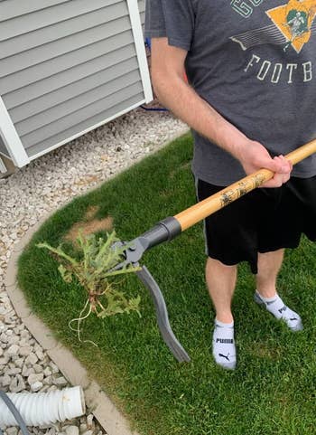 Promising review: "I love gardening, but I’m getting older now and weeding is backbreaking work…until I bought this product. It works like a charm, it grabs onto the rootstock, and you simply leverage it out of the ground, root and all. The other end of the lever works well too, like the claw of a hammer; it grabs onto smaller weeds and lifts them out of the ground. Now I can weed a large area in less than half the time without breaking my back…👍" —Michael D. Kutras