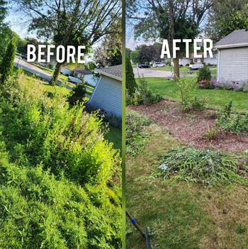 The reviewer who shared their before and after pics above said they have an autoimmune disease that makes pulling overgrown weeds tough — but with this handy tool, they were able to clear the 6-foot weeds from their garden bed!
