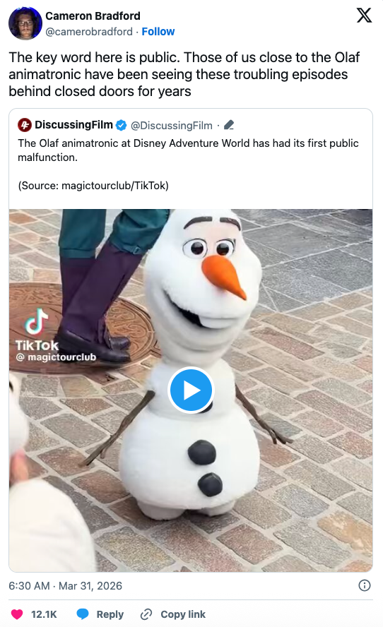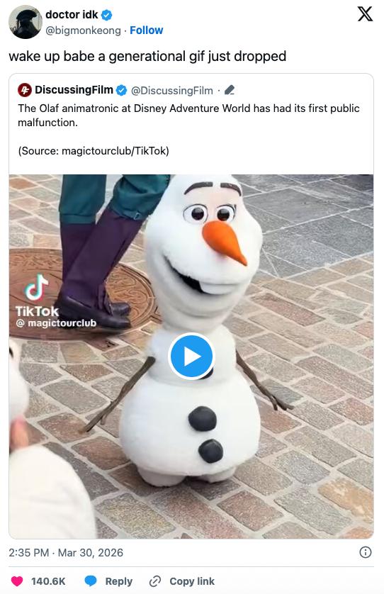 Looks like Olaf went "into the unknown." Angelica Martinez is the Latine Editorial Lead at BuzzFeed and covers a little bit of everything, from quizzes and true crime to celebrities and pop culture. *Kidding, kidding! Per park goer @coasterclairee, Olaf is back up and running today.