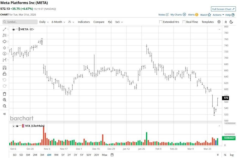 Meta Platforms (META) shares closed higher on March 31, in tandem with a broader market rally, amid reports that both the U.S. and Iran are now willing to de-escalate military hostilities. Following the surge, META looks headed to challenge its 20-day moving average (MA) this week. A clear break above the $611 level is expected to accelerate bullish momentum in the near term. Stock Index Futures Rally on Prospect of End to Middle East Conflict, U.S. Economic Data and Fed Speak in Focus Ignore the Panic and Buy the Dip in Micron Stock, Says Bank of America Stocks Climb on Hopes for an End to Iran War Get exclusive insights with the FREE Barchart Brief newsletter. Subscribe now for quick, incisive midday market analysis you won't find anywhere else. Year-to-date, META stock remains down about 12%, which, according to options pricing, may be an opportunity for long-term investors to load up on a quality name at a deep discount. According to Barchart, the put-to-call ratio on options contracts expiring mid-June is pinned at 0.3x currently, indicating a strongly bullish skew. This means that disciplined investors are positioning for a continued recovery rather than hedging for any further downside in META shares. In fact, the upper price on those contracts is pegged at $643, signaling this “Magnificent 7” name could rally another 12% within the next three months. It's also worth mentioning that historically, Meta Platforms rallies over 4% on average in April, a seasonal trend that makes it even more attractive to own in the near term. Beyond the relief rally, META stock’s fundamental story remains one of the most compelling in Big Tech. The company is currently trading at a relatively attractive price-to-earnings (P/E) multiple of about 18x — a steep discount compared to many of its AI peers. Plus, the Nasdaq-listed firm is aggressively pivoting toward “personal superintelligence,” with its Ray-Ban smart glasses already capturing more than 76% of that market. Meanwhile, management is streamlining operations by replacing third-party content moderators with high-efficiency AI systems, which have already shown superior performance in mitigating scams. With a massive $1.45 trillion market cap and a strategic focus on AI infrastructure and hardware, Wall Street sees META shares as well-positioned to capitalize on the next leg of digital evolution. The consensus rating on Meta Platforms sits at “Strong Buy” currently, with the mean price target of about $864 indicating potential upside of a whopping 50% from here. On the date of publication, Wajeeh Khan did not have (either directly or indirectly) positions in any of the securities mentioned in this article. All information and data in this article is solely for informational purposes. This article was originally published on Barchart.com