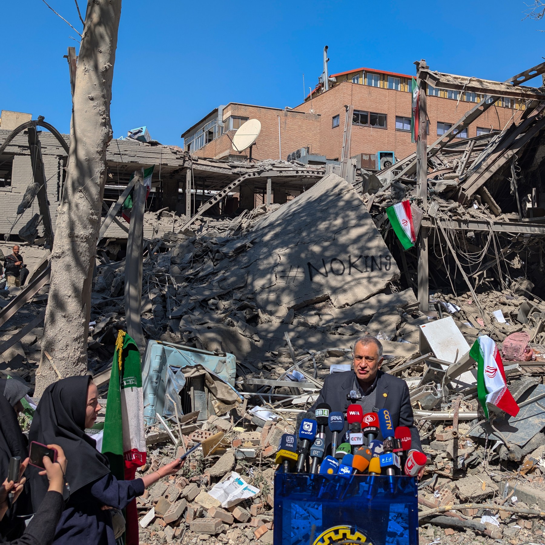 Inside the Sharif University on Tuesday, a mathematics professor held an online class inside the remains of a bombed building as a show of defiance and continuity.