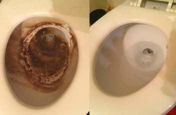 Promising review: "So, we have a toilet that belongs to the cats. We don't use it, we don't look at it, we like to pretend it does not exist. Even with semiregular flushing, cat waste is pretty nasty stuff and builds up quickly in the bowl. One of these wands cleaned it up in a single session! Before-and-after pic attached (above)." —Whitney