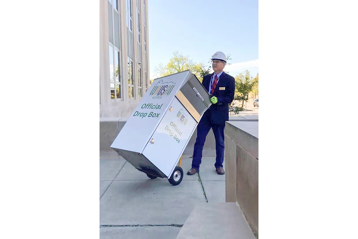 Wausau Mayor Doug Diny posed for photos wearing a hard hat and work gloves as he removed the drop box from outside City Hall in September 2024. City workers hadn't yet unlocked the box but voters had started to receive their absentee ballots, according to the city's elections clerk, Kaitlyn Bernarde.