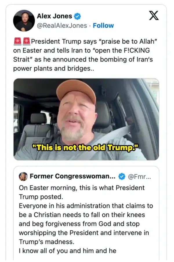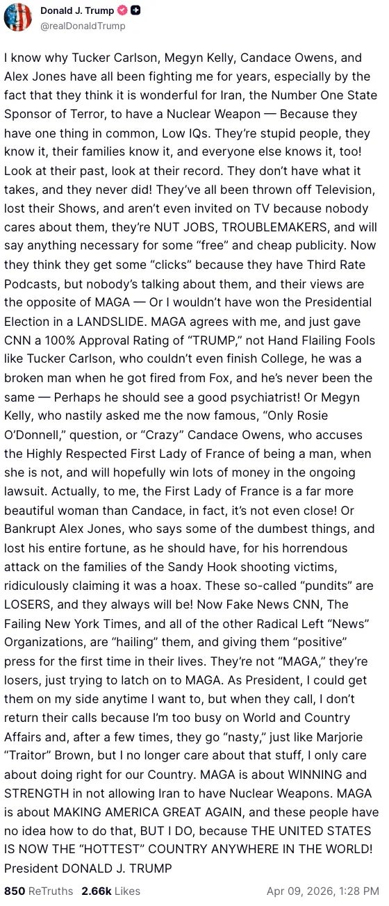 In this week’s Cringe Report, we’ve got a nepo baby cage match, an awkward moment on board Artemis II, and Trump’s most horrifying post yet. As a Senior Lifestyle editor at BuzzFeed, I cover stories about health, home, politics, and relationships, with a special focus on work and money. Trump: "How did I do with the voters that do eggs? Did anybody in the egg industry vote for Kamala? A low IQ person. She's a low IQ person." pic.twitter.com/a780ZGDwEb Trump needs to stop trying to make "panican" happen. It's never going to happen. Because nobody is reading all that, I've devised a new system to rank and rate Trump's TruthSocial tantrums based on how many swipes it takes me to clear the whole thing off my screen. The above is a 5-swipe meltdown. Q: You message has moved from 'the war is coming to an end' to 'we're gonna be bombing Iran to the stone ages.' So which is it?TRUMP: Can't tell you. I don't know pic.twitter.com/7wxNtp1ap7 Q: Does it constitute a war crime if the U.S. wipes out a civilization?Rubio: *ignores, walks away* pic.twitter.com/z2JZSaJzSk Vance: I have a special guest. Let's hope he actually answers or this will be very embarrassing.Phone: I'm sorry, the person you're trying to reach has a voicemail box that has not been set up yet pic.twitter.com/tepE8jbhvT JD Vance after campaigning for Viktor Orbán yesterday: "I find it ironic that people are accusing me of engaging in some kind of foreign influence" https://t.co/EyJL20k0RV pic.twitter.com/kt40noOVQH It's like rain on your wedding day, or a free ride when you've already paid, etc. Acting AG Todd Blanche: "I love working for President Trump. It's the greatest honor of a lifetime. And if President Trump chooses to nominate somebody else and asks me to go do something else, I'll say, 'Thank you very much, I love you, sir.'" pic.twitter.com/DXtQOVCRDG Hegseth: God deserves all the glory. Tens of thousands of strikes carried out under the protection of divine providence. A massive effort with miraculous protection. God is good. pic.twitter.com/SVgLtoyJl7 JD VANCE: With no disrespect to the cardinal, I don't know who Cardinal Christophe Pierre isREPORTER: He's the ambassador to the Holy Sea and USVANCE: Okay, I've met him before. Sorry. I just didn't remember the name. I've never seen this reporting. I'd like to talk to him. pic.twitter.com/TauVqVRtcF Jenkins: Democrats are already saying that this is taco—-Trump always chickens out. Let me give you another acronym—Nacho—never avoids confronting hard obstacles. pic.twitter.com/TtqNAYEAcK Hunter Biden is joining the Channel 5 live tour! You can get your tickets now! You might even see him in a live cage match against Don Jr. & Eric! https://t.co/UG6ocv5yfh pic.twitter.com/z8iRERGPri Trump: I'm polling higher than anybody has ever polled in Venezuela. So after I'm finished with this, I can go to Venezuela. I will quickly learn Spanish. It won't take too long. I'm good at language, and I will go to Venezuela. I'm going to run for president. pic.twitter.com/YlFJDlQxjG Awkward scenes aboard Artemis II as Trump stops ranting and none of the astronauts have anything left to say to him, leading to extended dead air pic.twitter.com/4PjfPhfgY8