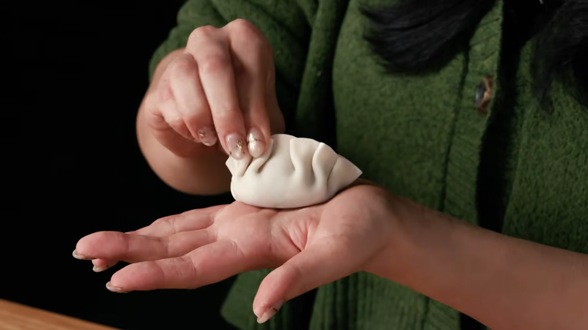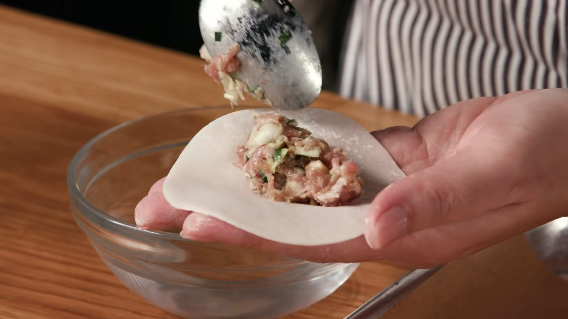 • The wang mandu fold (fold in half, pinch edges, then fold the two corners together like a hug) fits more filling than other shapes.