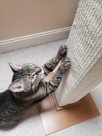 We hope you love our recommendations! While every product is independently chosen by our editors, BuzzFeed and our publishing partners may collect a share of sales or other compensation from the links on this page. You can read more about how our affiliate partnerships work in our Editorial Standards & Ethics Guide. Your kitties will be purring for their toys, treats, and even a self warming bed where they’ll be living out their best lives. As cat owners, we know how expensive of a commitment it is, from the vet visits to the constant restocking of food, litter, and other necessities — so spending even more money on cat products that don't work or don't last just isn't feasible. But if you're like me, you're always looking for ways to make life easier or make your kitties happier, and the products in this list can help you do just that, from problem-solving gems to simple toys that'll make them *literally* jump for joy. The tens of thousands of 5-star Amazon ratings are reason enough to add the ChomChom to your cart immediately — but let me add my own personal review to the stack. I've been using the ChomChom for quite a while now, and I took the photos above to show just how quick, easy, and effective this roller is. It took 10 seconds to rid my velvet couch ottoman of the hair my two gray kitties are constantly leaving everywhere. It takes a bit of practice to get the hang of using this roller — at first, I thought you only brushed down in one direction, and was confused why it wasn't picking up hair. It's important to do a push-and-pull brushing in *both* directions so it actually pulls the hair inside, which does require you to apply a bit of pressure. Afterward, you'll just dump out the hair that's been trapped inside. The ChomChom is best for large flat surfaces like couches and beds. Get it from Amazon for $19.99+ (available in three colors). I've been using this trapper mat for over a year now, and while it's pretty much impossible to eliminate all litter from your home if you own even one cat, let alone multiple, this mat has made keeping the floor of my litter box room MUCH more manageable. Unlike other mats, where the litter just kind of sits on top and eventually gets kicked elsewhere, this mat is designed so that the litter falls through the holes and stays inside the mat until you're ready to dump it. It's made out of an EVA material that's supposed to be gentle enough for cat paws, and my two kitties don't seem to have a problem walking on it. I *highly* recommend getting one of the larger sizes (I have the 30-by-24-inch mat) to extend the coverage area. Note that the mat will probably have a fold down the middle when it first arrives, but just give it some time and weigh it down with something if needed; it'll lay flat. Get it from Amazon for $13.99+ (available in four sizes and four colors). Carpet messes are undoubtedly the worst to clean up — it's "funny" how they always choose to have their accident there — but you can also use this on clothes and other surfaces like concrete and hardwood. Just be sure to follow the instructions carefully for non-carpet use. When it comes to my own experience with Rocco & Roxie, well...let's just say we're no stranger to cat accidents 'round these parts, and I keep this stuff stocked at all times. Between my younger one's hairballs and my older one's vomiting, I've accidentally stepped in piles of yuck more times than I care to count, and this bottle is what I reach for whether the mess is on my hardwood floor or carpet. It always lifts the stain, without any detectable odor left behind. Get it from Amazon for $23.92+ (available in two sizes and two scents). To install, just hook the cat perch into the rail of the window, push the brackets forward until they rest against the wall, then tighten the thumb screws. Check that your window matches the size requirements on the listing before buying! There's a helpful graphic (second photo on the listing) that shows the dimensions required. Promising review: "My cats are obsessed with these window beds. I have now ordered several of them to have in different rooms. Easy to put together and sturdy enough to hold several 12+ pound cats." —Laura Williams Get it from Amazon for $28.99+ (available in four colors and two sizes). Promising review (get ready, this is my favorite cat name ever): "My cat Gambino Bambino would let you brush him bald!!! He loves to be groomed and comes running whenever the brush comes out. Though we love to accommodate, I know he wanted more. He was constantly rubbing his cheeks and ears on the corner of our walls to get even more scratching. I finally came across this product and knew he would love it! It took a little convincing, but once he got the hang of it, he’s been loving it! We have one in the living room, one in the kitchen, one at the top of the stairs, and one in the guest room! He is having a great time!!! Very easy to put together and place on the wall." —T. Mangiaracina This is THE cat bed, y'all. Neither of my cats have ever really taken to a cat bed and much preferred to doze on their cat tree or curl up on a regular blanket — until I finally caved in and bought the Aspen self-warming bed a while back. IMMEDIATELY upon placing it on my couch, one of my cats crawled into it and happily began napping. As soon as he moved away, my other cat jumped in to take it for a test run as well — and immediately curled up as well. After about a week of them taking turns using it (literally, the cat *not* in the bed would lay next to it waiting for the other to leave — my polite boys 🥹), I realized I needed to buy a second one. They immediately took to that one as well, and now, they both have access to their favorite bed whenever they like! Whenever I put my hand underneath them, I can definitely feel how warm they are underneath, so the bed's self-warming feature seems to work well. I think what they love most about it is the shape and how 