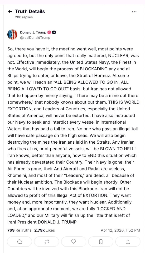 President Donald Trump is not receiving the support from “other countries” that he prematurely said he would. The United Kingdom, a key U.S. ally, has said it will not take part in the blockade of the Strait of Hormuz that Trump, 79, announced on Sunday in a series of threatening posts on Truth Social. “We continue to support freedom of navigation and the opening of the Strait of Hormuz, which is urgently needed to support the global economy and the cost of living back home,” a UK government spokesperson said, as reported by the BBC. “The Strait of Hormuz must not be subject to tolling,” the spokesperson added, directly contradicting Trump’s claim that he instructed the U.S. Navy to “seek and interdict every vessel in International Waters that has paid a toll to Iran,” following failed peace talks between the two countries on Saturday. The statement comes as Trump has reportedly been growing increasingly frustrated with NATO allies for not supporting the United States after it launched a surprise war on Iran in coordination with Israel on Feb. 28. During an appearance on Sunday Morning Futures with Maria Bartiromo, Trump launched into a tirade against countries—including the UK and Germany—for “not being there” for the U.S. while also claiming that he thinks “numerous countries are going to be helping us” with the newly announced blockade. Since the start of the conflict, the president has demanded that NATO allies help reopen the Strait, which was effectively closed after Iran placed mines throughout much of the waterway, bringing a critical passage for roughly one-fifth of global oil shipments to a standstill. Yet, some top NATO allies have rejected the president’s calls for help in the region. In an interview for ITV’s Talking Politics podcast, UK Prime Minister Sir Keir Starmer said he was “fed up with the fact that families across the country see their bills go up and down... because of the actions of Putin or Trump.” In March, UK Energy Secretary Ed Miliband told the BBC that the country was exploring “any options” to help reopen the Strait, but government officials were reportedly wary that sending ships or aerial minesweepers to clear the waterway could escalate the crisis, according to The Guardian. “We are urgently working with France and other partners to put together a wide coalition to protect freedom of navigation,” the UK spokesperson said on Sunday, as the Wall Street Journal reported earlier this week that the White House is considering measures against allies that do not back its war with Iran, including the possible withdrawal of American troops from NATO states. On Saturday, the president claimed that the US was “clearing out” the Strait “as a favor to Countries all over the World,” with U.S. Central Command later confirming the mission. “Incredibly, they don’t have the Courage or Will to do this work themselves,” the president posted on Truth Social. The Daily Beast has reached out to the White House for comment.