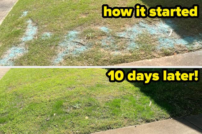 Promising reviews: "Before and after [above] of using the Rapid Grass + extra fertilizer for lawn bald spots from Sunday. This before and after is only 10 days of growth. I also applied a thin layer of top soil to let the grass root more." —Chandler Varonfakis