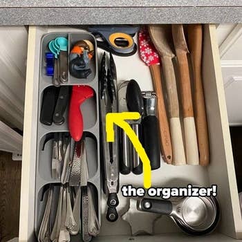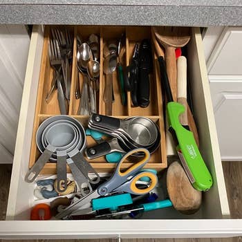 Promising review: "Fits my drawer like a glove AND holds my silverware set for 12! Heavy-gauge plastic construction that does not give way even when fully loaded. This has opened up so much more space in my drawer, making it easier to find other serving pieces and the odd items in that drawer. Love it, highly recommend it. Before purchasing, measure your drawers to make sure they will fit. I love that it can lie parallel to the drawer front. I was concerned that my flatware would stick out too tall for my stock cabinetry drawer, but that is not a problem." —Kindle Customer