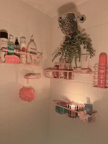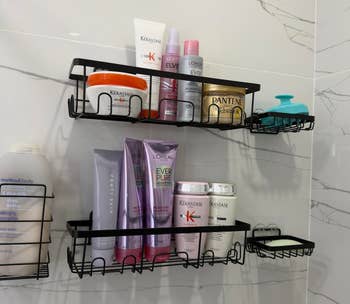 Promising review: "Perfect for my tile shower that had no shelving. I am able to fit a lot on the shelves with no hassle or worry that they might fall. I'd suggest hooking the baskets first to the adhesive and then removing the back of the adhesive and sticking it onto the tile with the basket, so it applies evenly." —Amazon Customer