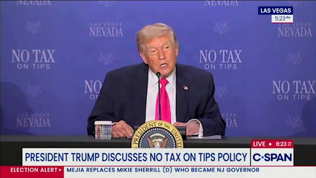President Donald Trump appeared confounded by a common phrase during a public appearance in Nevada on Thursday. The president was in Las Vegas to promote his βno tax on tipsβ policy, and was joined by Secretary of the Treasury Scott Bessent and Nevada Lieutenant Governor Stavros Anthony for an event at the AC Hotel. Delivering a speech on the benefits of his policy, which allows employees who receive tips to deduct up to $25,000 in tips when filing their taxes, the 79-year-old came across a term he claimed to have never heard before.