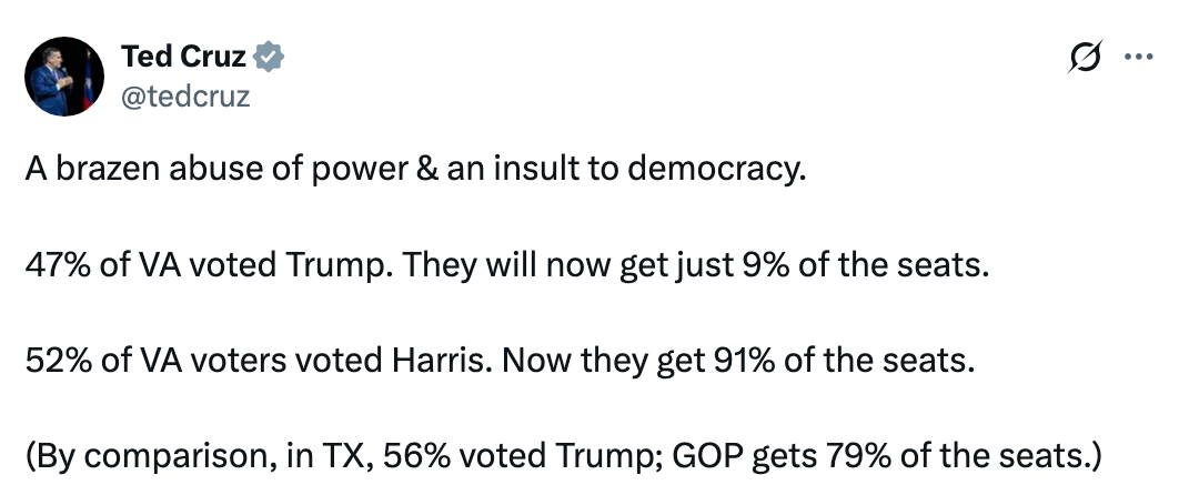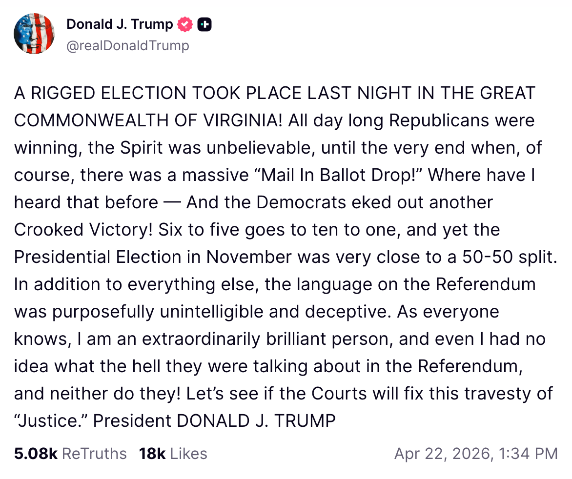Trump warns Virginians that if they vote YES for fair elections tomorrow, he will lose power: “If Democrats get these additional seats, they'll change things at the federal level.” pic.twitter.com/G8lsEtUMLt
