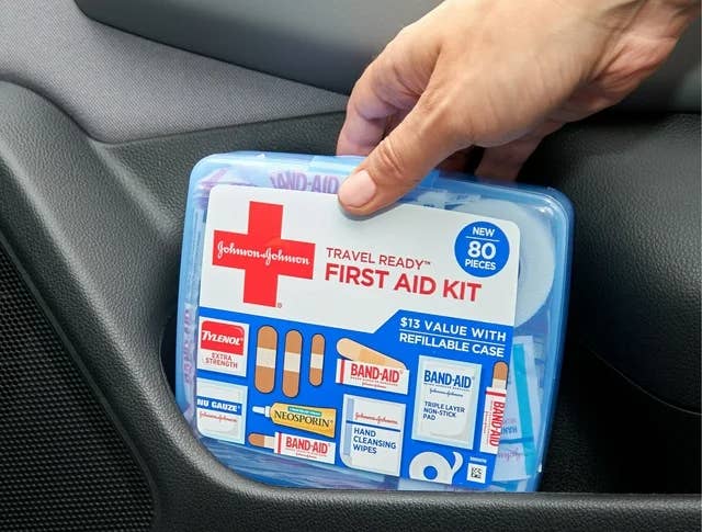 Contains 30 adhesive bandages in assorted sizes, 21 sheer adhesive bandages, hand-cleansing wipes, 10 gauze all-purpose dressings, and one full-sized Neosporin antibiotic ointment.