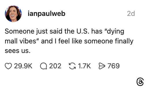“Someone just said the U.S. has ’dying mall vibes’ and I feel like someone finally sees us.”