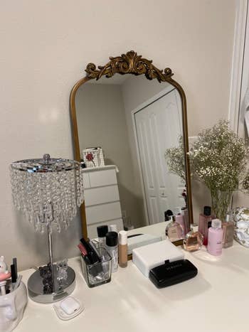 Promising review: "I hopped on the gold ornate mirror trend and spent a long time trying to find one within my budget. I was worried at first because there weren’t any reviews when I first bought this. It looked amazing online and was the perfect size, so I went ahead and got it. I am THRILLED with this purchase!!! One of the best things I’ve gotten from Amazon. It’s beautiful and exactly how it looks in the pics. It came four-ish days faster than estimated. It’s perfect for my makeup desk. If there were different sizes of the same mirror, I would buy all of them." —McKinlee Mayer
