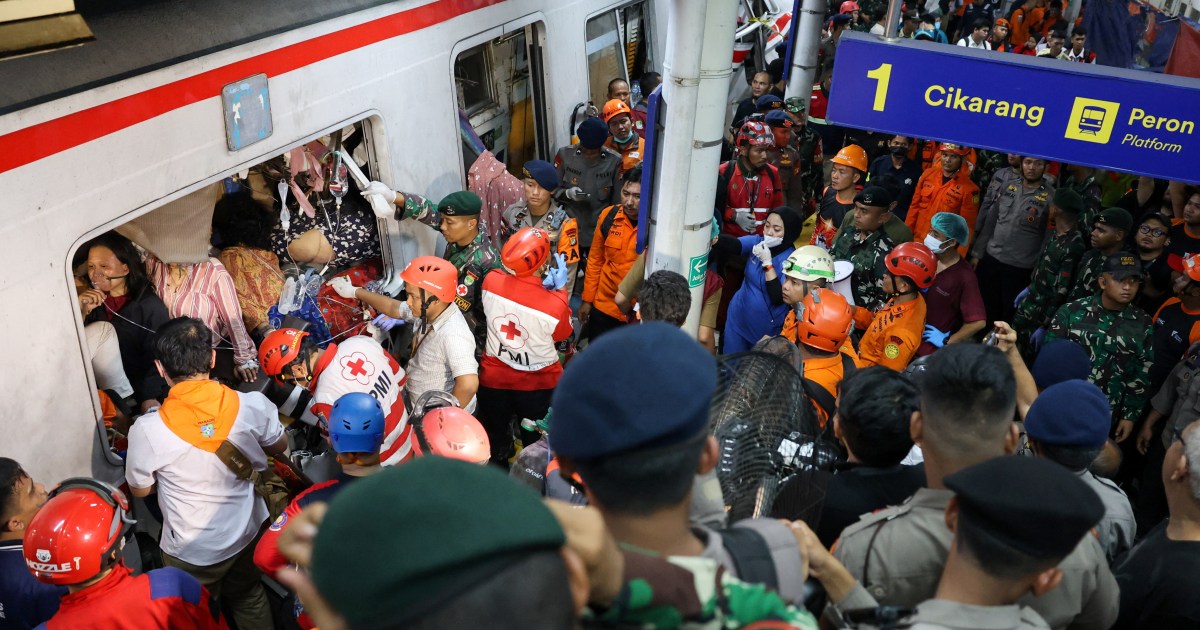 ⁠Fourteen people have been confirmed killed and more than 80 injured in a collision involving two trains near the Indonesian capital, Jakarta, with rescue workers continuing efforts to free passengers trapped in the wreckage.