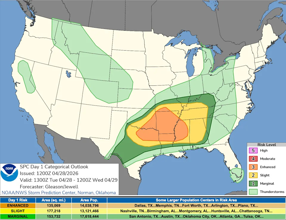 Storms that swept across the Midwest and Great Lakes overnight triggered warnings across several states as a powerful spring weather system moved east, though only a small number of tornadoes had been confirmed by April 28. At least one person was killed late Monday in Kent County, Michigan, during the storms. Authorities say a 39-year-old man from Solon Township died after a tree fell during a passing thunderstorm, NBC News reported. Responders found the man at the scene, and the Kent County Sheriff’s Office said he had been struck by the fallen tree. He was pronounced dead at the scene. The overnight storms were part of a broader severe weather outbreak that is expected to continue April 28 as the system pushes farther east and new storms develop to the south. Severe storms are now expected to remain active through at least midweek, with the Storm Prediction Center warning of multiple rounds of thunderstorms capable of producing very large to giant hail, damaging winds and a few tornadoes Tuesday, followed by additional scattered severe weather potential Wednesday. "Multiple rounds of severe thunderstorms will occur across parts of the southern Plains into the lower Mississippi/Tennessee Valleys and Southeast through this evening," the Storm Prediction Center wrote for Tuesday's severe weather outlook. "Very large to giant hail (2-4+ inches), swaths of severe/damaging winds, and a few tornadoes are all possible." The outbreak comes during a volatile spring pattern that has brought back-to-back rounds of severe thunderstorms since late March, including hail, high winds and tornadoes. The Storm Prediction Center has issued an Enhanced Risk for severe thunderstorms stretching from the southern Plains into the lower Mississippi Valley, Mid-South and parts of the Southeast, with the highest risk area centered on a broad corridor from North Texas, including the Dallas–Fort Worth region, through Arkansas and into parts of Mississippi. Meteorologists say a large-scale upper-level trough over the Plains is helping drive a series of disturbances that will move east through the day. At the surface, moisture continues to surge northward from Texas into Oklahoma and the lower Mississippi Valley, fueling a very unstable environment. Elevated supercells are already ongoing in western North Texas early Tuesday, April 28, with additional storm development expected through the afternoon and evening. Forecasters warn that storms will likely come in multiple rounds, with the potential for different hazards depending on timing and location. Key threats include: Very large to giant hail, up to 2 to 4 inches in diameter or larger Damaging wind swaths, especially as storms cluster and move east A few tornadoes, particularly with discrete supercells Tornado watch issued? Here's what to do when sirens go off Elevated thunderstorms are already underway in western North Texas early Tuesday, with more storms expected to form this afternoon along a boundary between hot, dry air and warm, humid air in the region. Forecasters say parts of North Texas into the ArkLaTex are especially primed for strong storms, with a very unstable atmosphere that can quickly fuel rapid storm development and strong wind patterns that support rotating storms, according to the Storm Prediction Center. "A cold front and dryline will bring a chance of thunderstorms today and tonight, some of which may be severe," the National Weather Service in Fort Worth-Dallas wrote. "The highest severe weather threat will likely be this afternoon and evening for areas near and east of I-35." The storms come just three days after a deadly storm and tornado break out killed two in Runaway Bay, Texas, according to NBC News. As storms move east into Arkansas and the lower Mississippi Valley later in the day, forecasters expect some evolution into larger storm clusters, which may shift the dominant threat toward more widespread damaging winds while still supporting hail and isolated tornadoes. Farther north into the Tennessee Valley, the atmosphere is expected to recover behind morning convection, potentially allowing additional storms to redevelop later Tuesday into the evening. Looking ahead to Wednesday, a Marginal Risk of severe weather remains in place from southern Texas through the north-central Gulf Coast and into parts of the Mid-Atlantic, according to the Storm Prediction Center's outlook for Wednesday. While coverage is expected to be more scattered, isolated strong to severe storms could still produce hail and gusty winds, particularly where daytime heating and lingering boundaries overlap. Additional storm development is also possible across the Appalachians into the Mid-Atlantic as an upper-level system approaches from the west. Despite tornado warnings across the Midwest and Great Lakes overnight, preliminary data from the Storm Prediction Center early Tuesday shows only three confirmed tornadoes. Those reports came from Illinois and Arkansas, though officials caution the numbers are still preliminary and could change as National Weather Service damage surveys continue over the coming days. The reported tornadoes include: Germantown, Illinois, in Clinton County, where large trees and street signs were reported down around 1:08 a.m. local time Near Hanover, Arkansas, in Stone County, where a radar-confirmed tornado was reported around 3:31 a.m. Near Greenfield, Arkansas, in Craighead County, where multiple reports and social media images showed a rope tornado near Highway 1 and County Road 452 around 5:48 a.m. A high number of tornado warnings does not always translate into a high number of confirmed tornadoes. Warnings are issued when radar shows rotation or conditions are favorable for a tornado, meaning they often cover storms that do not fully produce one or produce brief, weak touchdowns that take time to confirm. More: Is a Super El Niño coming? How it could shape your weather Brandi D. Addison covers weather across the United States 