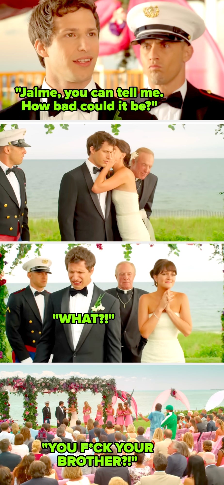 "The bride should’ve worn a 'Less negging, more pegging' shirt as a rebuttal."