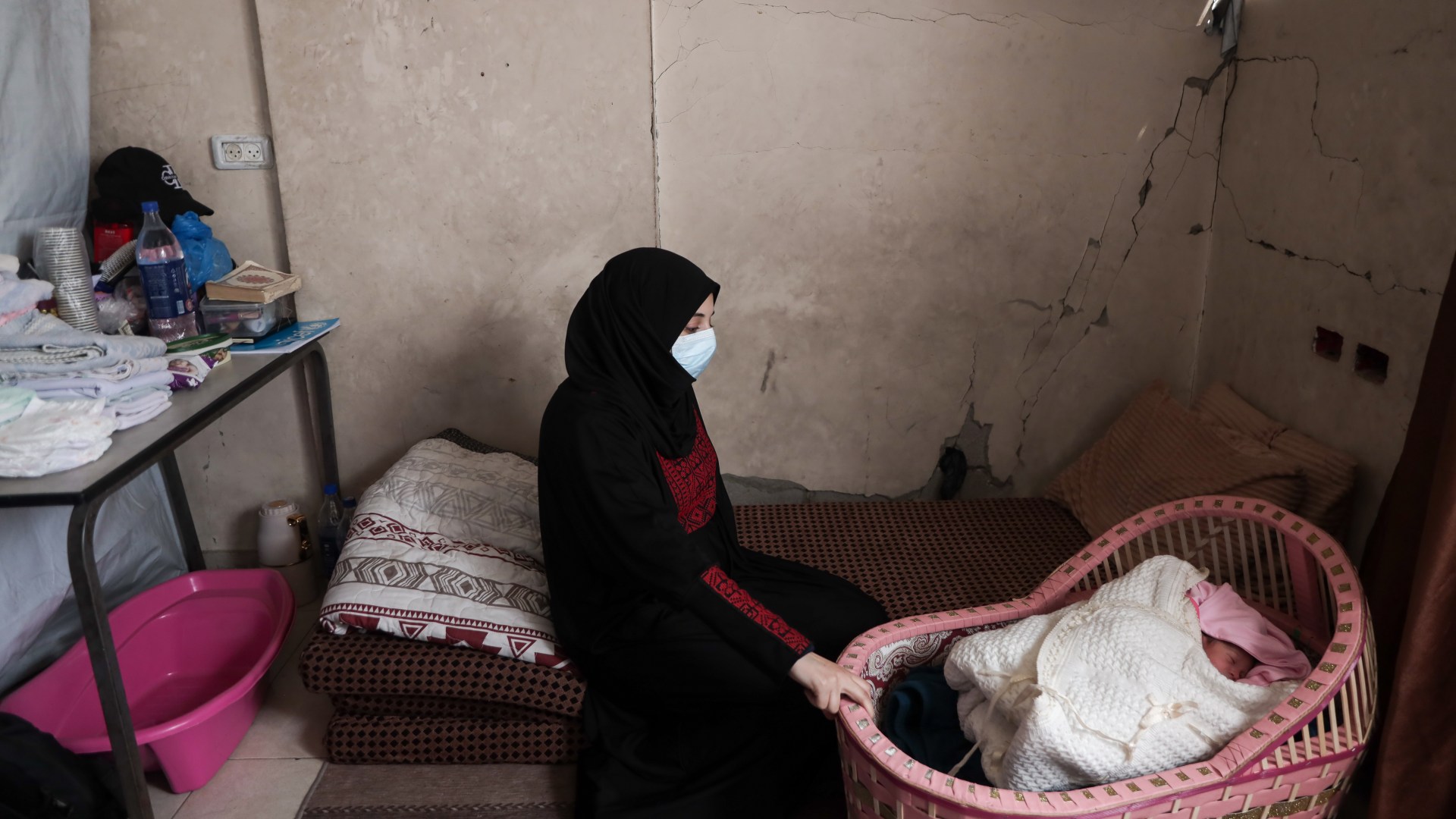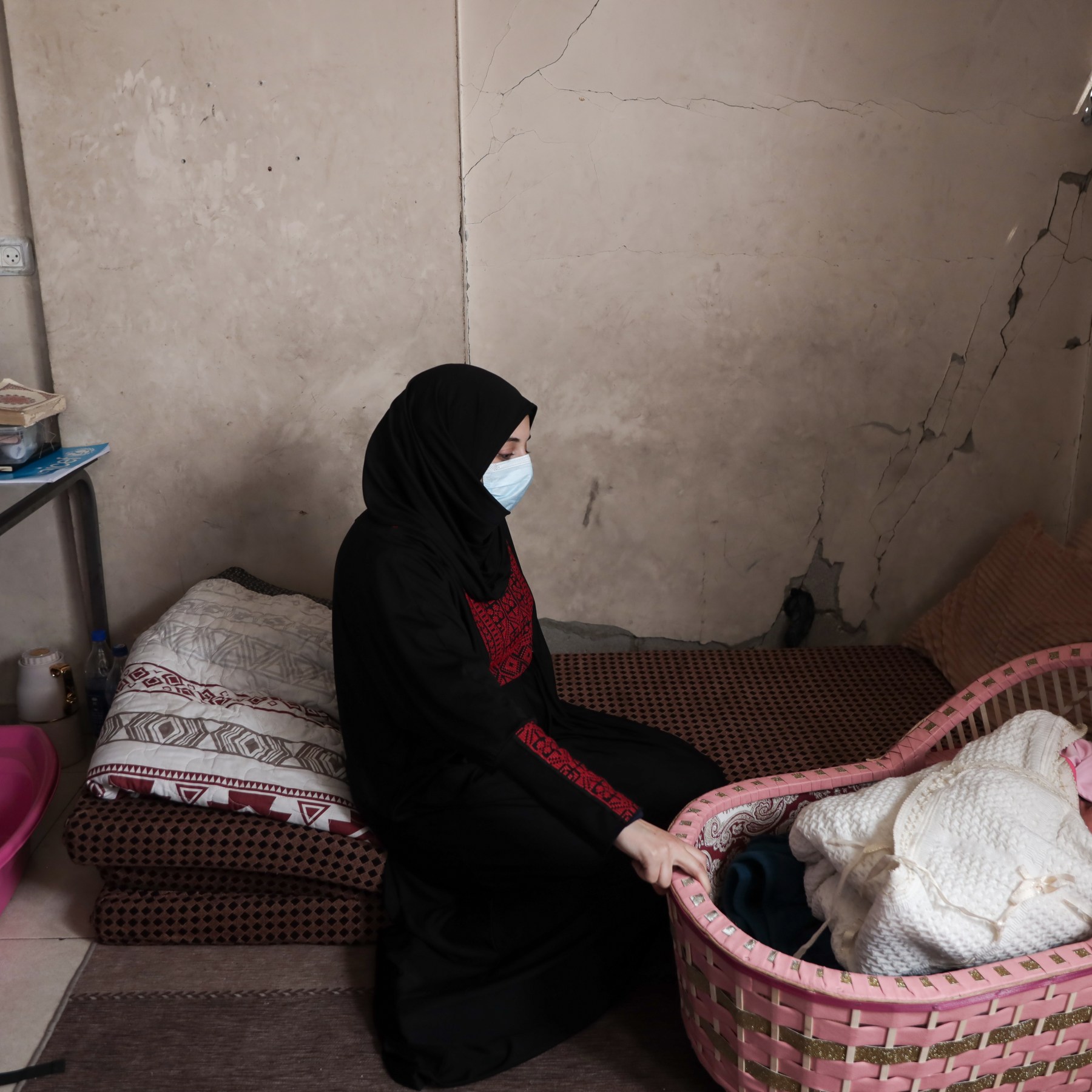 Gaza City, Gaza Strip – On a mattress placed on the floor of a half-destroyed apartment, Duha Abu Yousef sits holding her newborn baby with great difficulty after an emergency caesarean section was performed following her arrival at a hospital the night before.