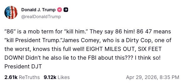″’86′ is a mob term for ‘kill him.’ They say 86 him! 86 47 means ’kill President Trump.’James Comey, who is a Dirty Cop, one of the worst, knows this full well! EIGHT MILES OUT, SIX FEET DOWN! Didn’t he also lie to the FBI about this??? I think so! President DJT,” Trump wrote on Truth Social.